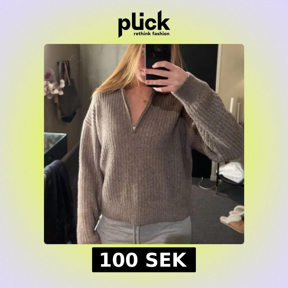 Säljer en mysig beige ribbad tröja med dragkedja framtill. Tröjan har långa ärmar och en bekväm passform, perfekt för kyligare dagar.