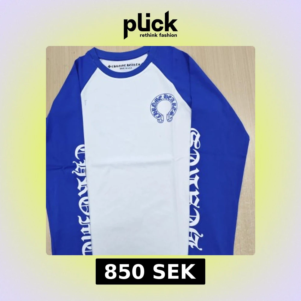 Snygg långärmad tröja från Chrome Hearts i blått och vitt. Tröjan har blå ärmar med tryck längs sidorna och ett stort Chrome Hearts-tryck på ryggen. Materialet är mjuk bomull och passformen är normal. Perfekt för dig som gillar streetwear och tydliga loggor.