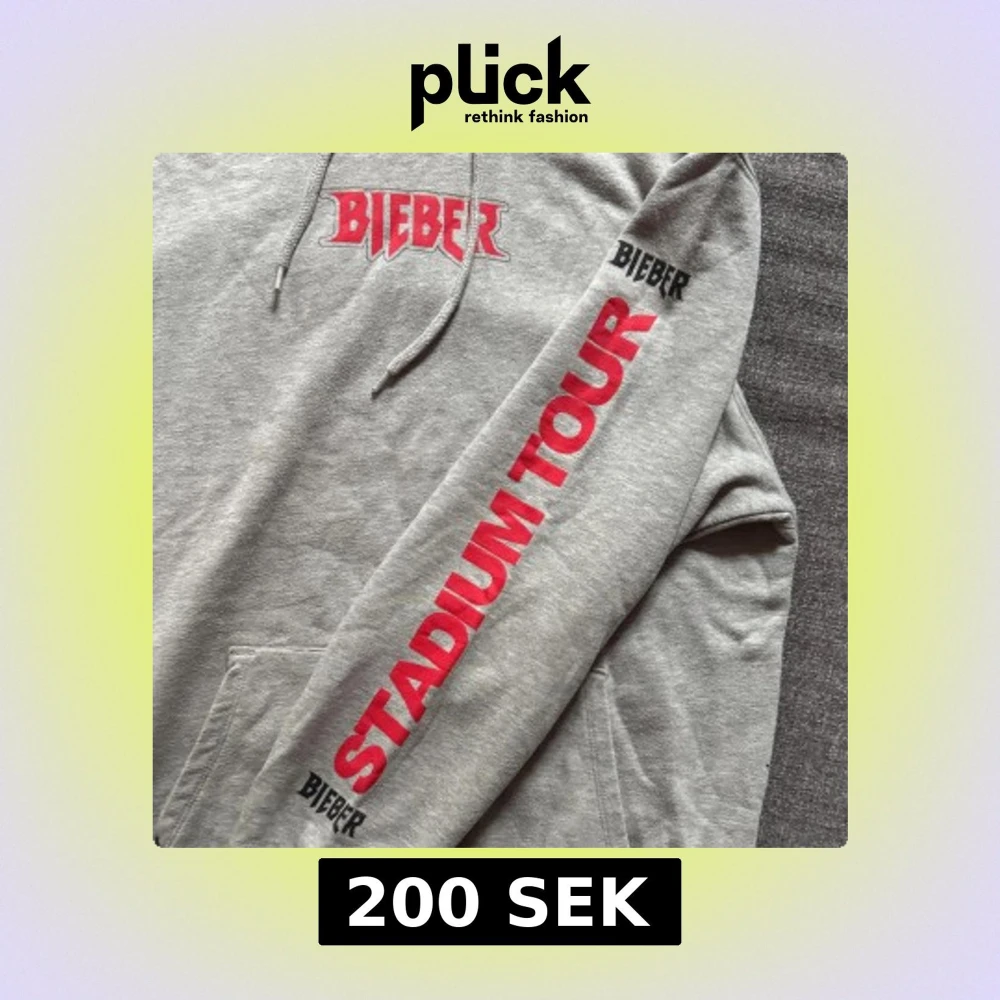 Säljer en grå hoodie från Bieber Stadium Tour med röd logga på bröstet och ärmen. Stor tryckt bild på ryggen med motorcykelmotiv och texten 'Stadium Tour' i rött. Klassisk känguruficka och huva med snörning. Perfekt för dig som gillar streetwear och musikmerch.