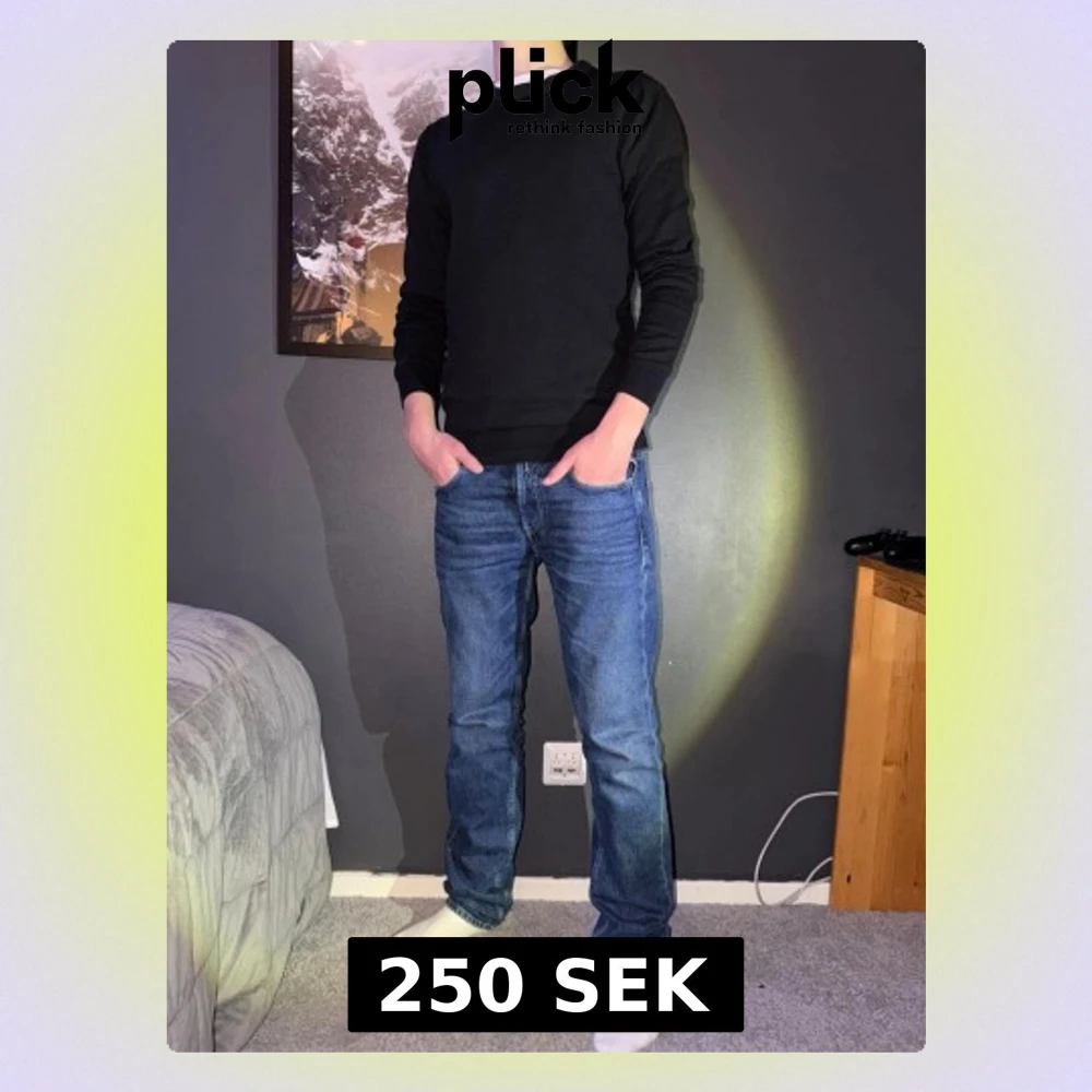 En stilren svart långärmad tröja i mjuk bomull. Tröjan har rund halsringning och ribbade muddar vid ärmslut och nederkant. Perfekt att matcha med jeans eller över en t-shirt för en clean look. Går att köpa med ett par jeans för bättre pris. Storlek S. Han på bilden är 177
