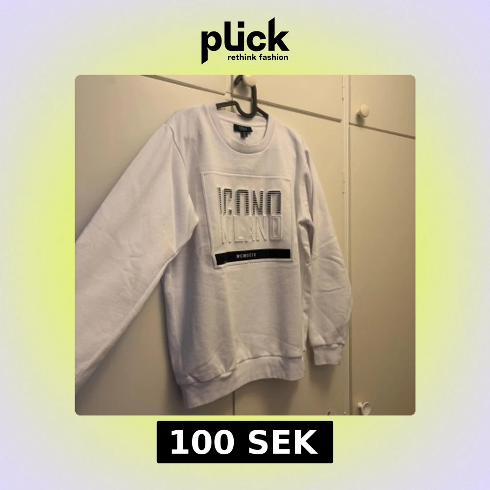Säljer en vit sweatshirt från SMOG med texten 'ICONO MILANO' i svart och vitt på framsidan. Tröjan har en normal passform och är tillverkad i ett mjukt material som känns skönt mot huden. Perfekt för en avslappnad stil.