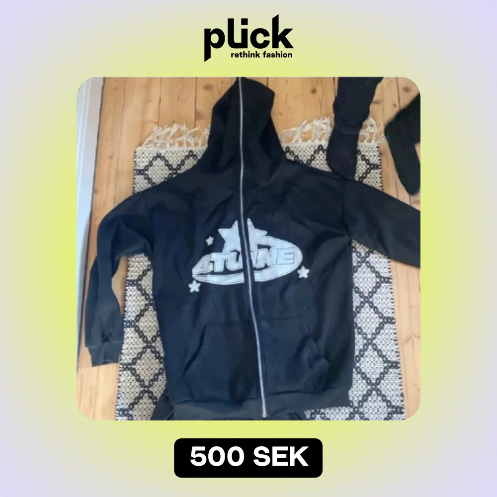 Säljer en svart hoodie med dragkedja och matchande byxor. Hoodien har ett stort tryck på framsidan med texten 'ATUNE' och en stjärna. Byxorna har ett matchande tryck med texten 'NAPS' och en stjärna. Perfekt för en avslappnad dag eller träning. Båda plaggen är i bra skick och väldigt bekväma.