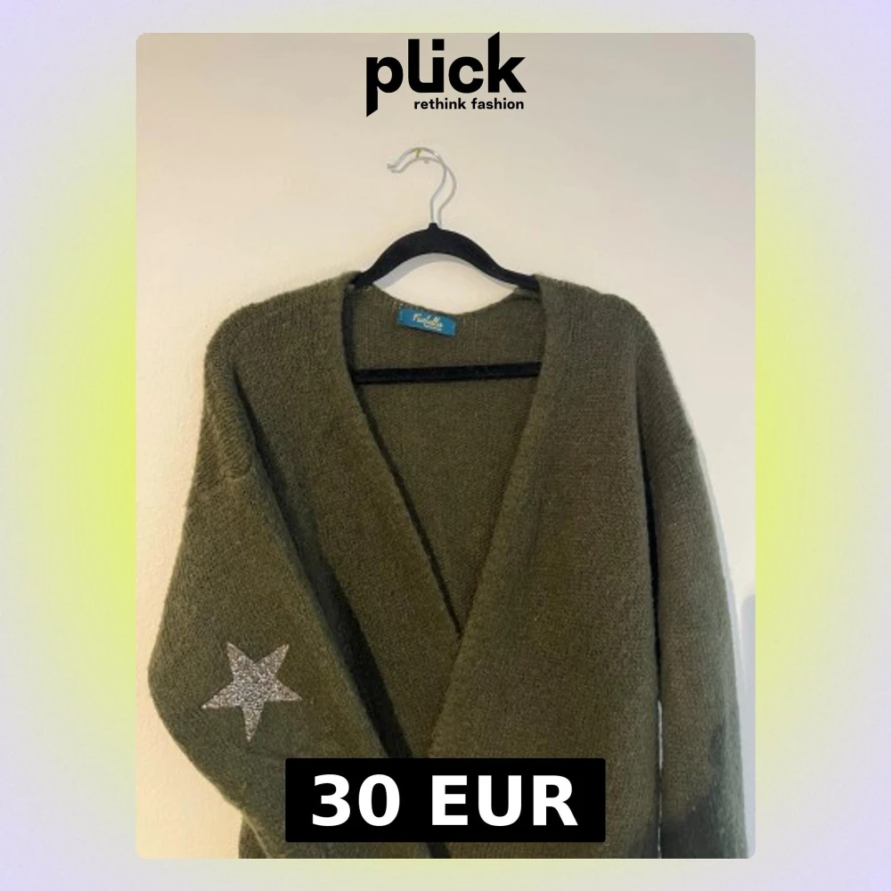 Mysig olivgrön kofta från Funky Staff med djup V-ringning och lång ärm. På vänster ärm finns en glittrig silverfärgad stjärna som snygg detalj. Koftan är stickad i ett mjukt material och har en avslappnad passform.