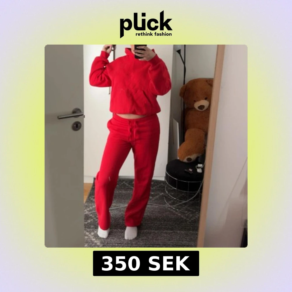 Säljer en röd hoodie och byxor med en bekväm och avslappnad passform. Hoodien har en klassisk design med huva och långa ärmar. Perfekt för en casual look eller mysiga dagar hemma. Limit edition från Gina Tricot och använd endast en gång.