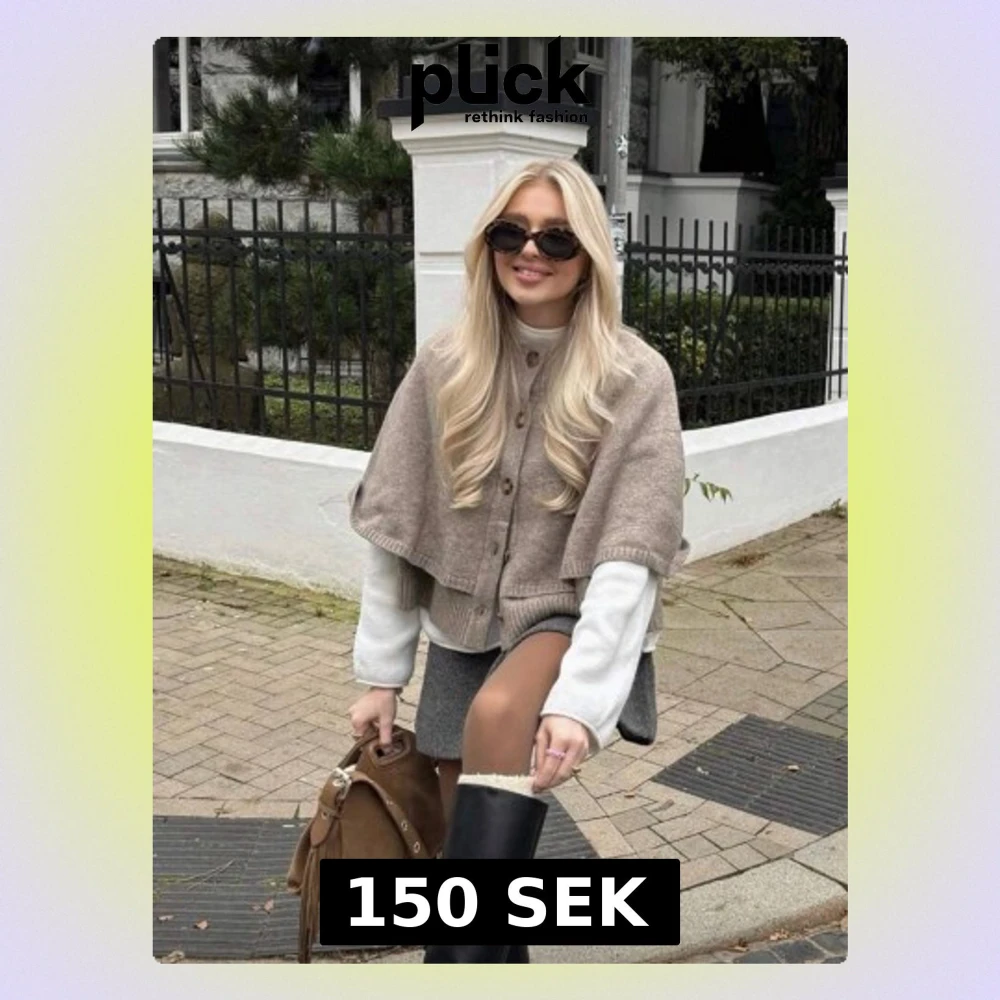 Trendig beige stickad cape-kofta med stora knappar framtill och ribbade kanter. Modellen är kort och har en avslappnad passform, perfekt att slänga över en tröja. Materialet känns mjukt och ger en snygg lager-på-lager-look.