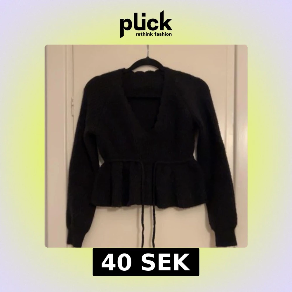 Säljer en svart stickad kofta med knytband i midjan och volangdetaljer. Koftan har långa ärmar och en v-ringad design. Perfekt för att hålla sig varm och stilren. Från SHEIN.
