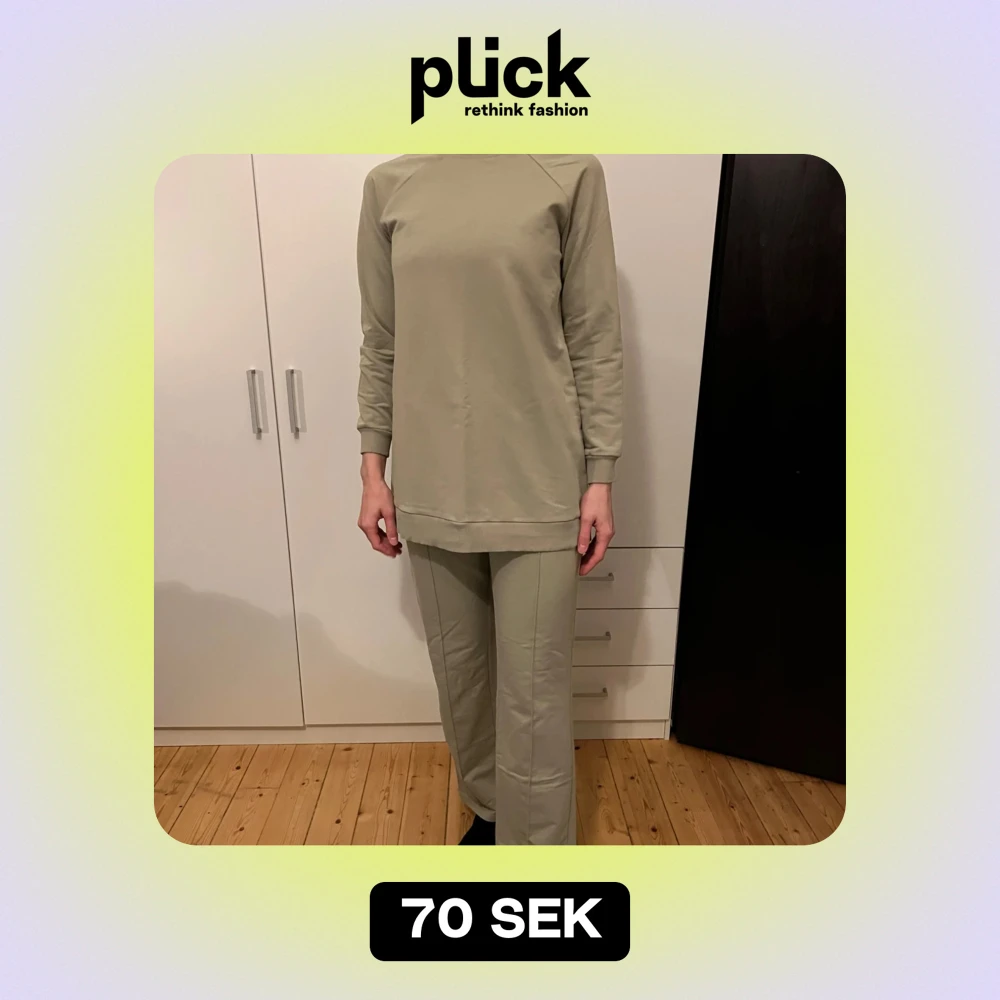Säljer en stilren och bekväm set. Perfekt för en avslappnad look eller mysiga dagar hemma. Tröjan har en normal passform och är gjord i ett mjukt material som känns skönt mot huden. Byxorna är vida och bekväma