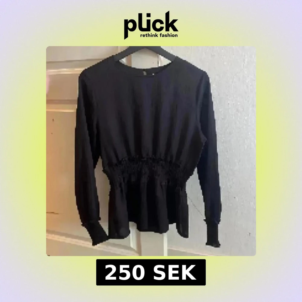 Säljer en svart blus med rund hals och långärmade ärmar. Blusen har smockad midja som ger en snygg siluett och volang vid nederkanten. Materialet är lätt och har en skön känsla mot huden. Perfekt för dig som gillar stilrena och enkla plagg.