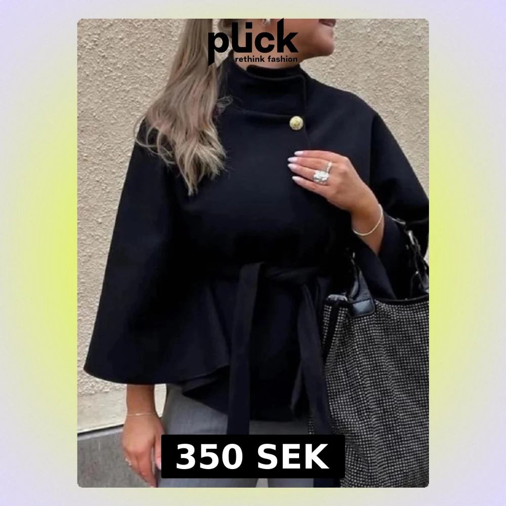 Kappa med hög krage, dekorativ guldig knapp vid axeln och knytband i midjan. Vida trekvartsärmar ger en trendig siluett. Perfekt för dig som vill ha en chic och modern look. Använd ett fåtal gånger, den är som ny, jag kan posta så snabbt som möjligt vid snabbt köp