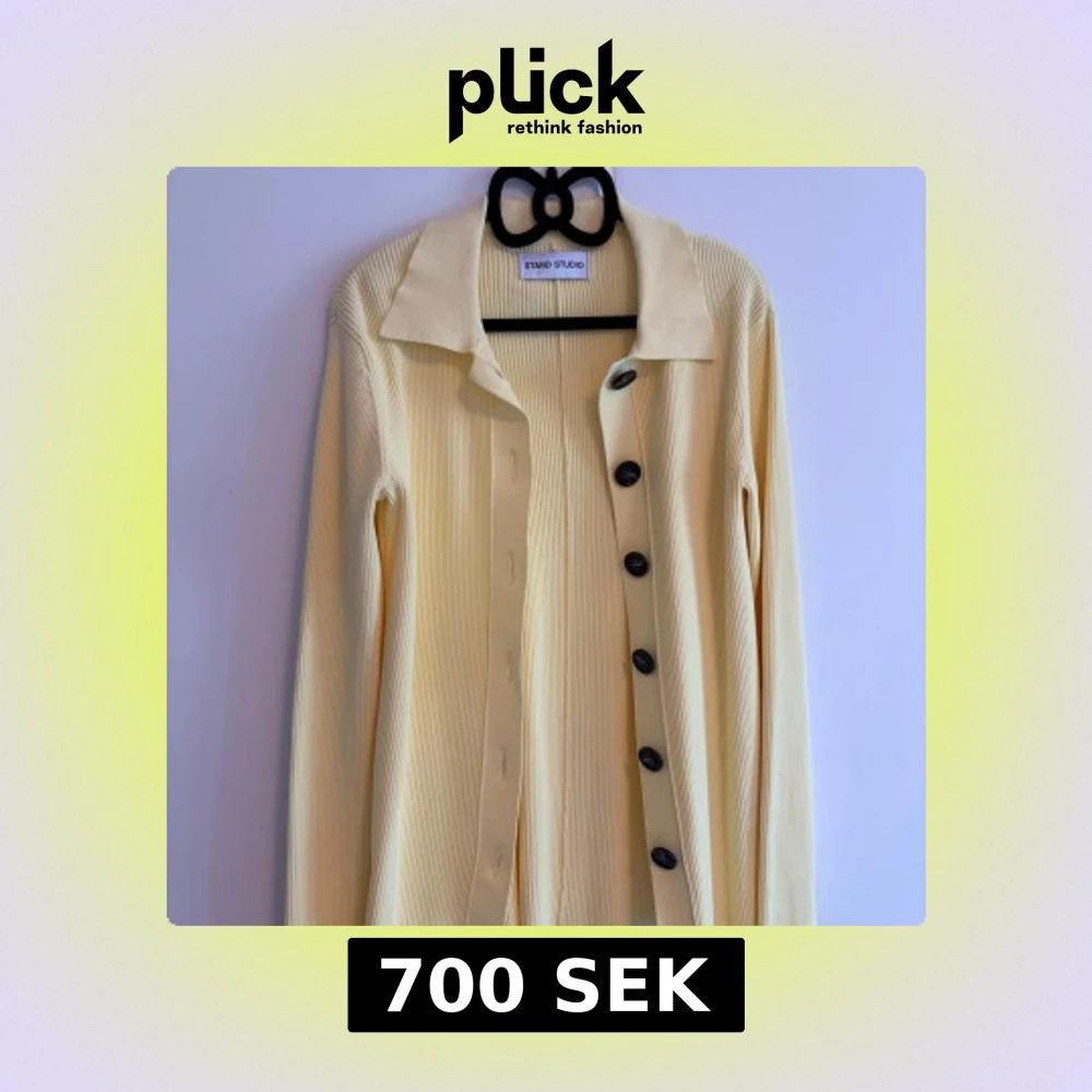 Säljer en ljusgul ribbad kofta från Stand Studio med klassisk krage och svarta knappar framtill. Koftan har lång ärm och är tillverkad i en mjuk blandning av viskos och polyester. Perfekt för dig som gillar stilrena och fräscha plagg.