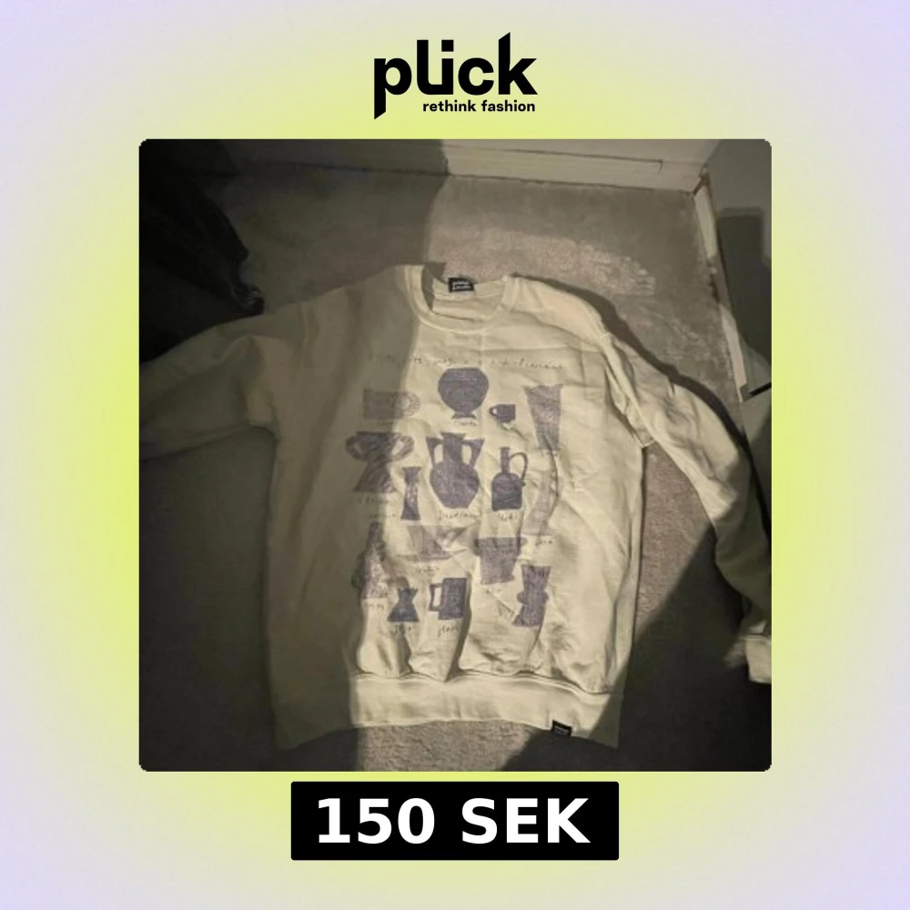 Säljer en vit sweatshirt från Vintage Supply med ett unikt tryck av olika vaser och kannor i mörkblått. Tröjan har en avslappnad passform och rund halsringning. Perfekt för en stilren och bekväm look.