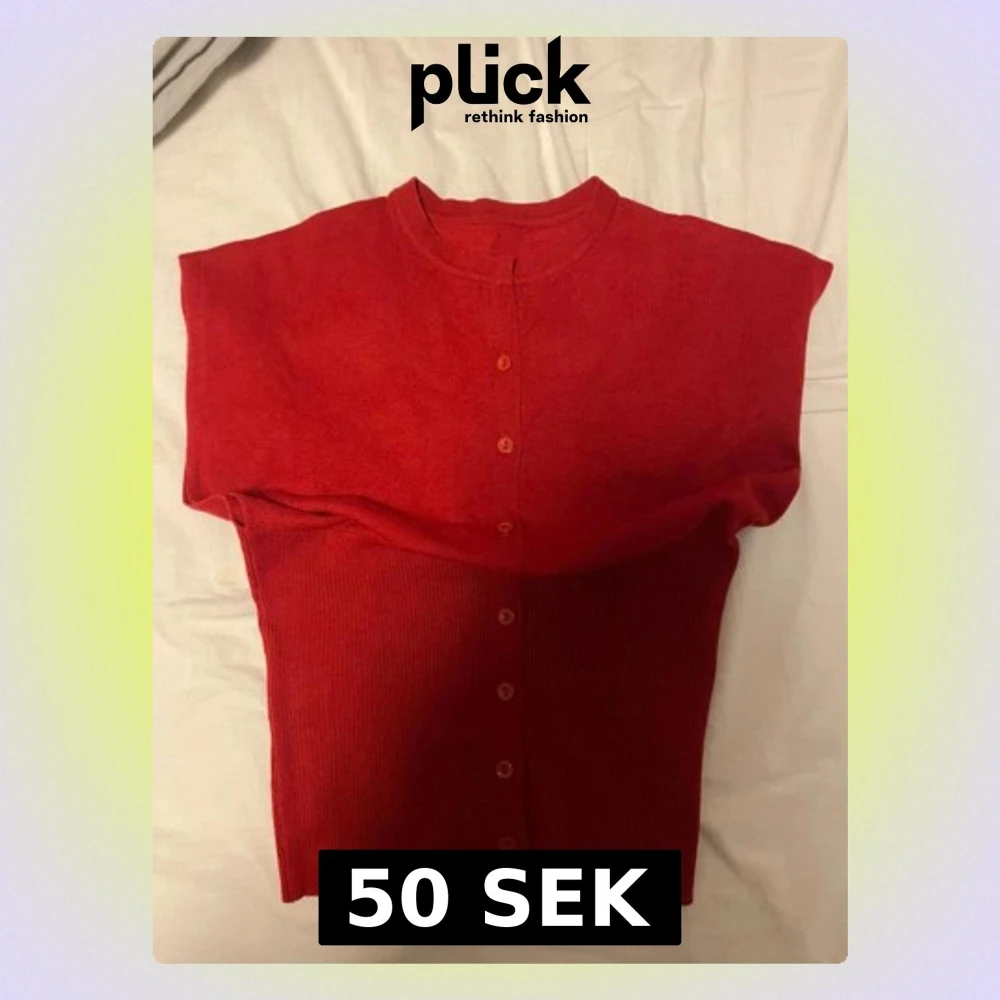 Snygg röd kortärmad kofta med rund hals och knappar framtill. Materialet är stickat och mjukt. Använd aldrig, passar inte riktigt i röd färg därför säljer jag.