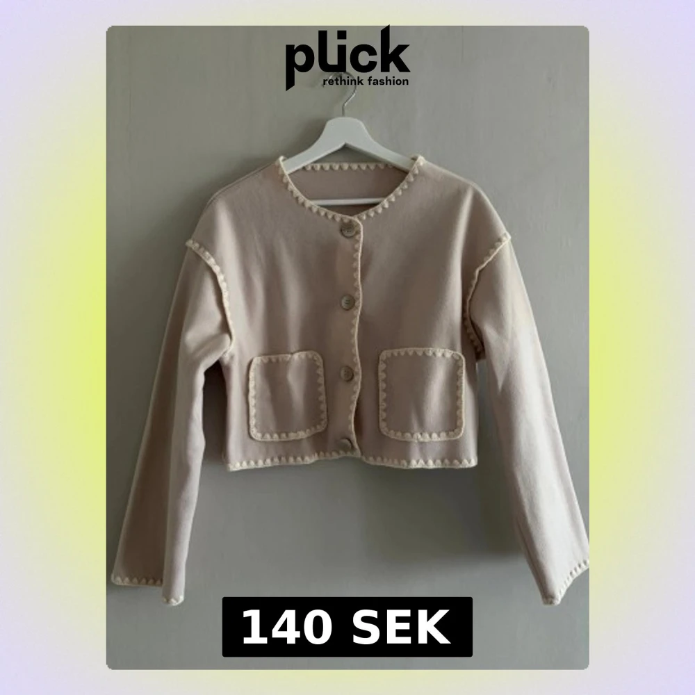 Söt ljusbeige kofta med dekorativa virkade kanter i vitt, rund halsringning och fyra knappar framtill. Två stora fyrkantiga fickor framtill ger en trendig look. Koftan är croppad och har långa ärmar, perfekt för lager på lager.