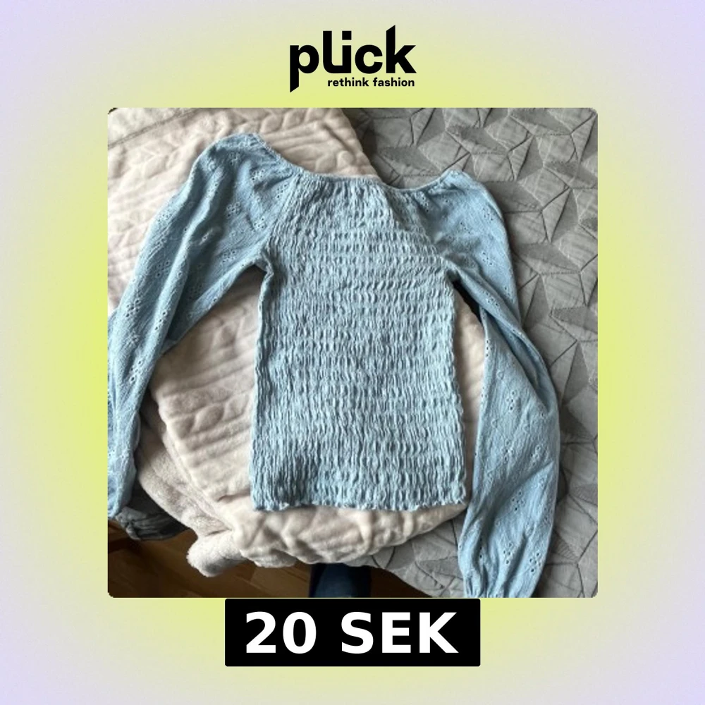 Supersöt ljusblå blus med smockad kropp och långa puffärmar i broderad bomull. Blusen har en offshoulder-design och är perfekt för vår och sommar. Materialet är mjukt och har fina hålbroderier på ärmarna som ger en romantisk vibe.
