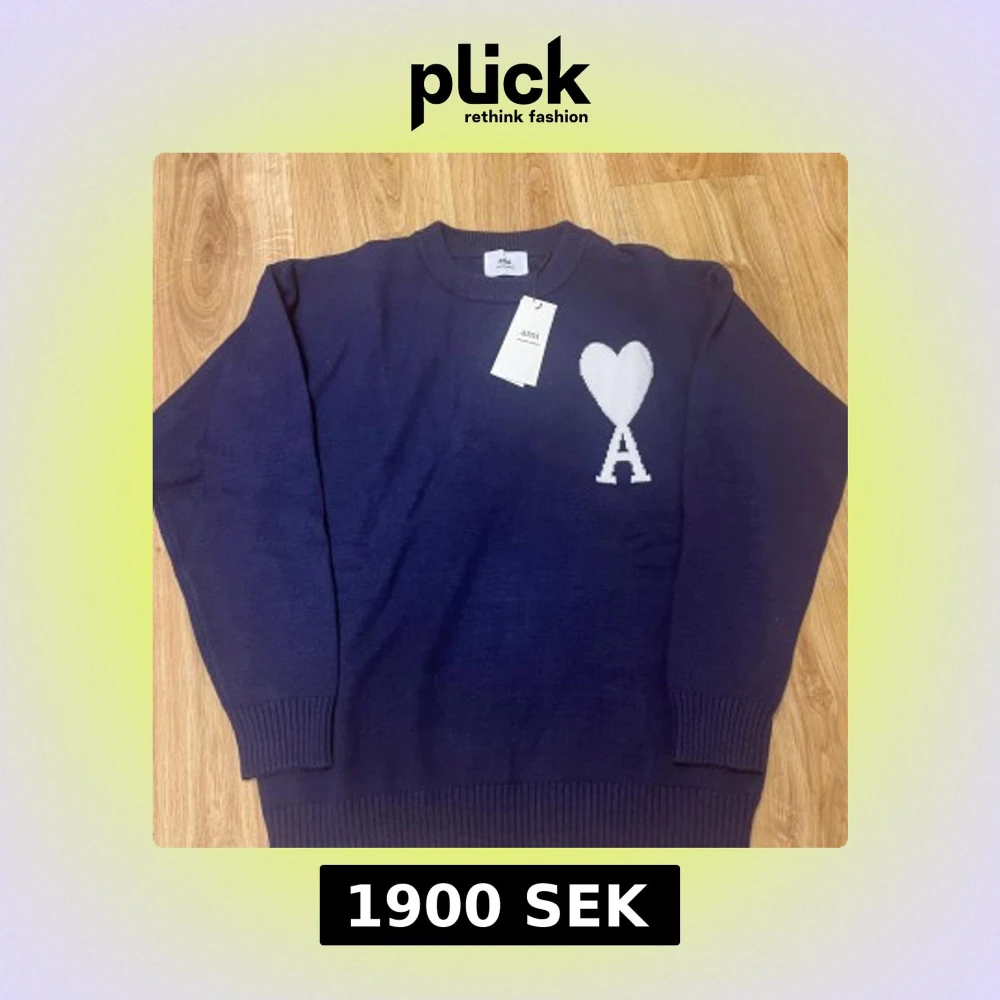 Säljer en snygg mörkblå tröja från Ami Paris med ett vitt hjärta. Tröjan har långa ärmar och ribbstickade muddar vid ärmslut och nederkant. Perfekt för en stilren look. Storleken på tröjan är S, men passar även som M. Priset på tröjan kommer att vara på 1900kr och kan sänkas vid snabbt köp