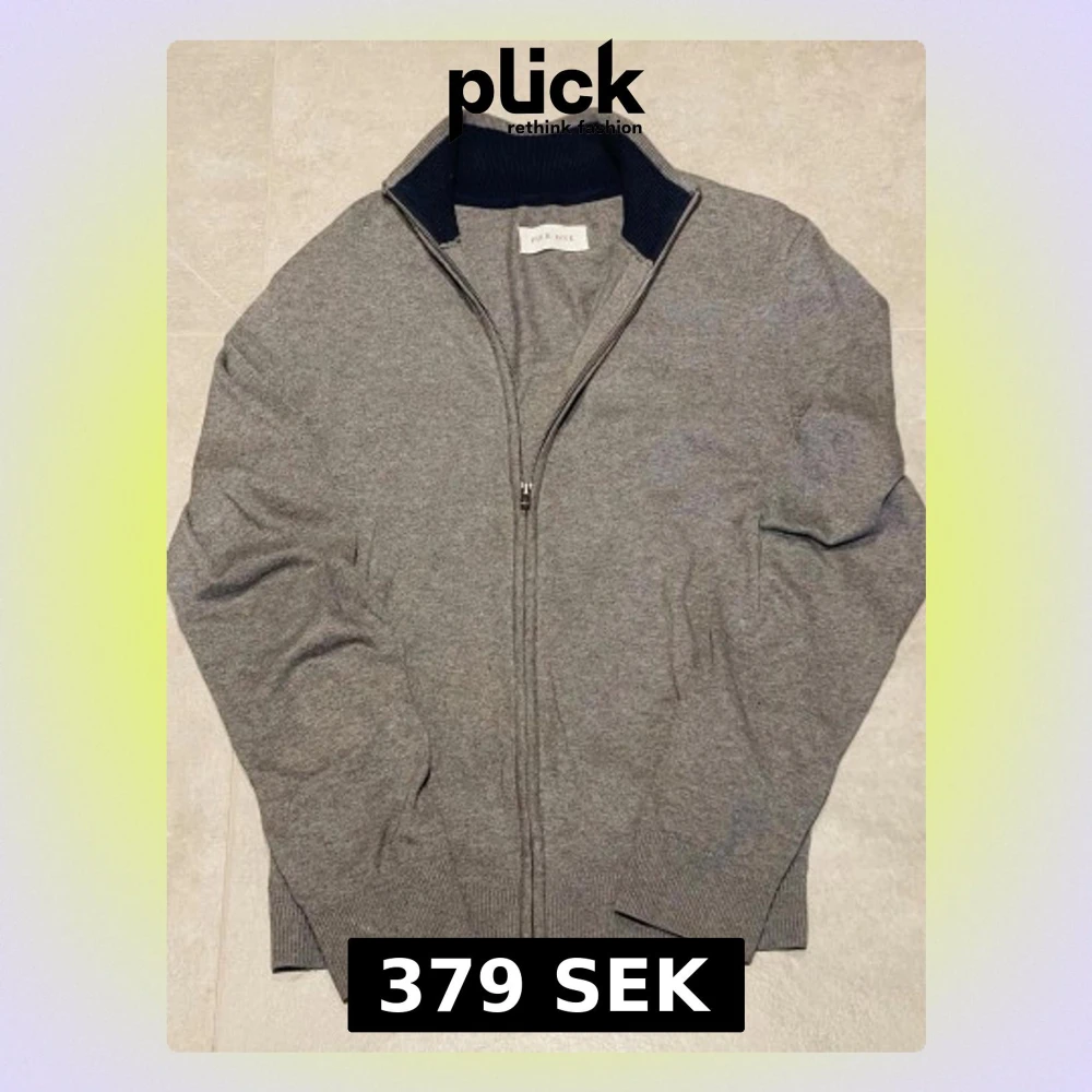 Säljer en stilren grå kofta från Pier One i storlek S. Koftan har ribbade muddar, ståkrage med mörkblå insida och hel dragkedja framtill. Materialet är mjukt och känns som bomull, perfekt för lager-på-lager under höst och vinter.