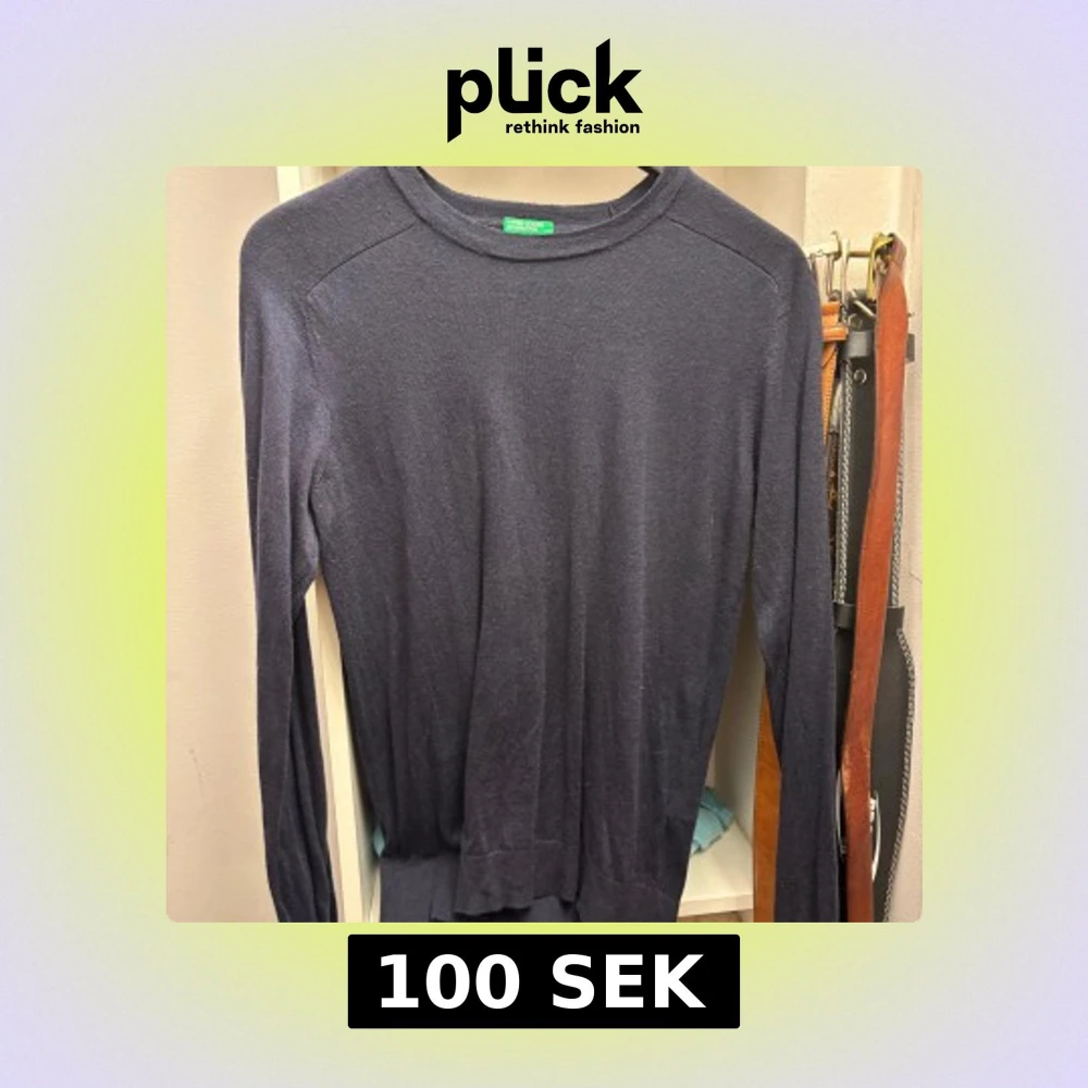 Säljer en stilren mörkblå tröja från Benetton. Tröjan har en klassisk rund hals och långa ärmar, perfekt för kyligare dagar. Den är tillverkad i ett mjukt material som ger en bekväm passform. Passar bra till både jeans och chinos.