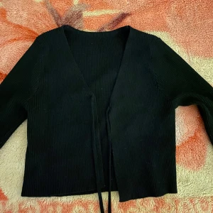 Säljer en stilren svart ribbad kofta med knytband framtill. Koftan har en v-ringad design och långa ärmar, perfekt för lager-på-lager under kyligare dagar. Passar till både vardag och mer uppklädda tillfällen.