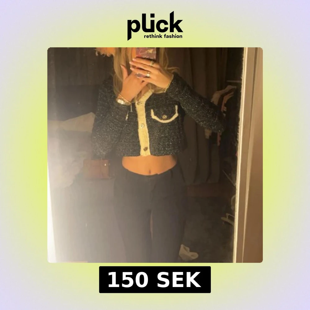 Snygg svart glittrig kofta med vita kanter och dekorativa knappar. Den är croppad och har långa ärmar, perfekt för att ge en stilren touch till din outfit. Passar fint till en kjol🩷 köp för 250kr aldrig använd, bara tvättad men säljer pga flytt