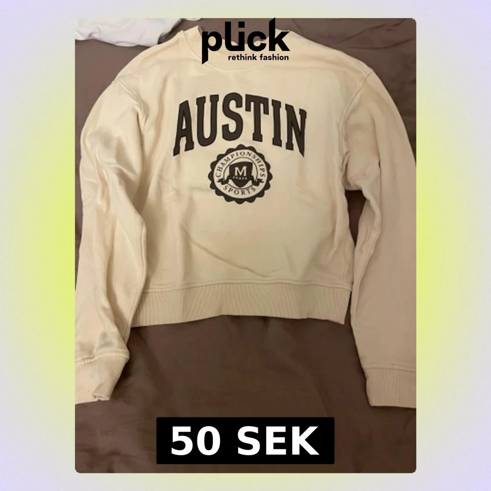 Säljer en beige sweatshirt från H&M Divided med trycket 'AUSTIN' och sportigt emblem framtill. Tröjan har rund hals, ribbade muddar och är långärmad. Perfekt för dig som gillar college-vibe och enkel stil.