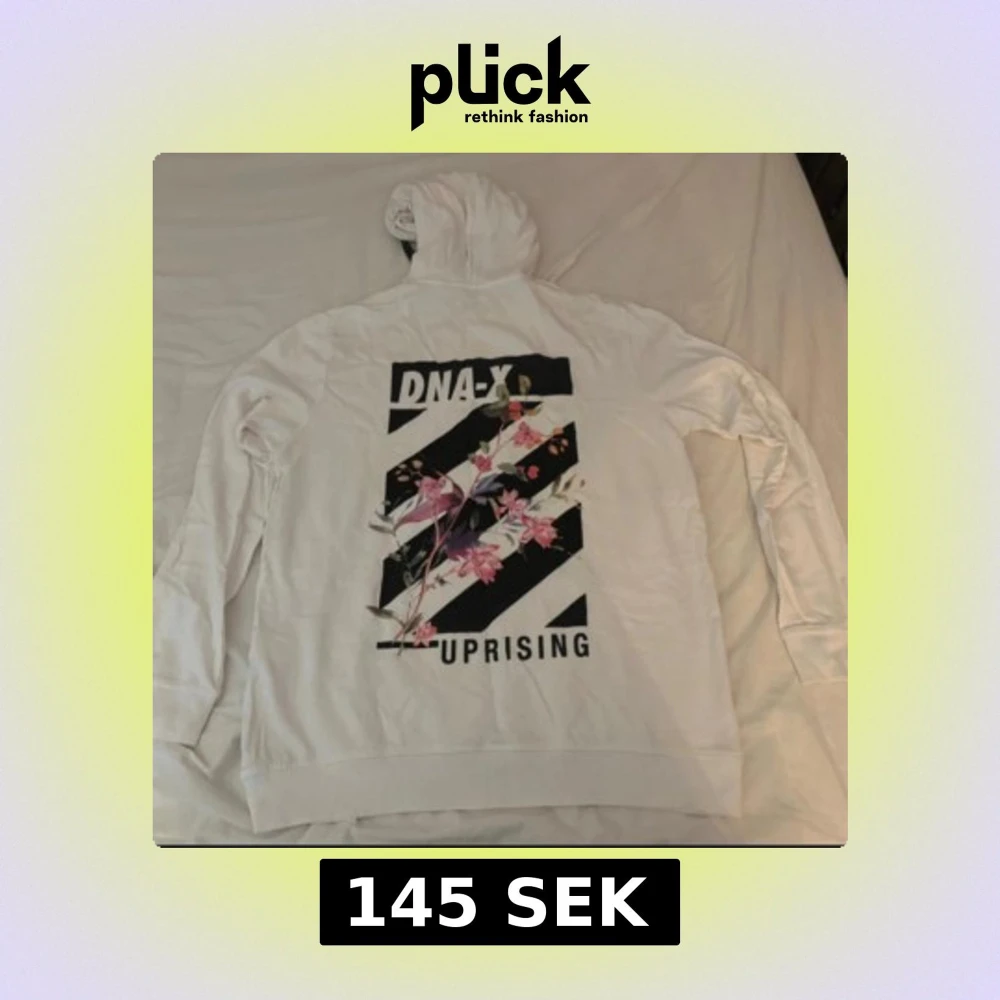 Säljer en vit hoodie från YOURTURN med tryck på baksidan. Den har en stor ficka fram och en justerbar huva med svarta snören. Perfekt för en avslappnad stil.