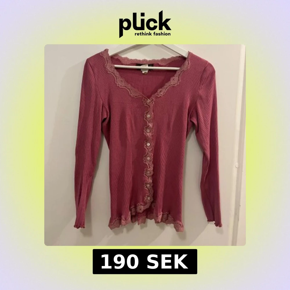 Säljer en söt rosa ribbad kofta från Rosemunde med spetsdetaljer längs kanterna och knappar framtill. Koftan har långa ärmar och en v-ringad design.