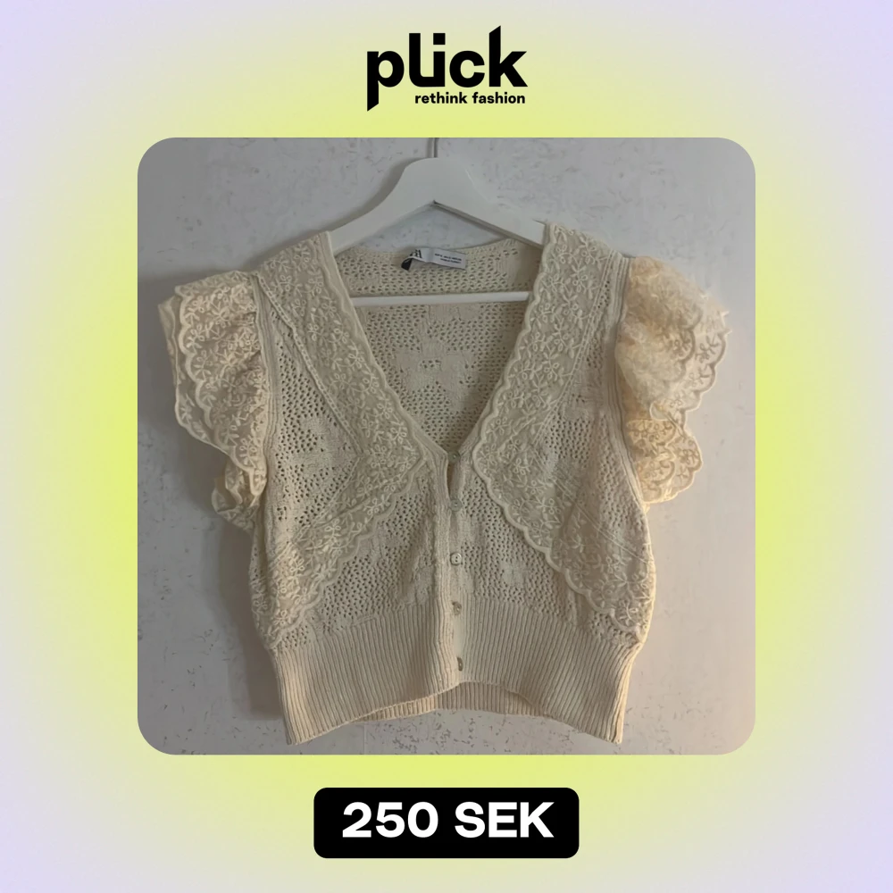 Säljer en superfin beige spetskofta från Zara. Den har korta ärmar med volangdetaljer och knappar framtill. Använt en gång och inga defekter 💕