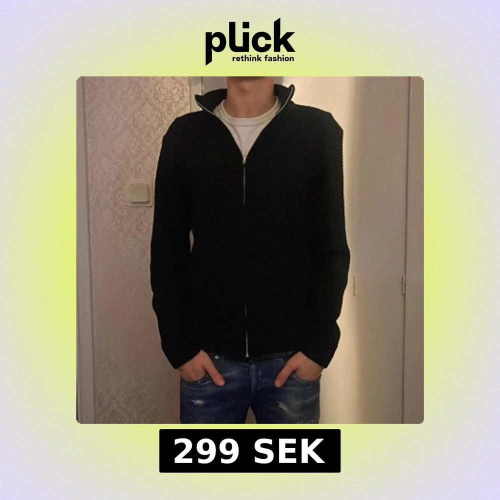Svart stickad kofta med hel dragkedja framtill och hög krage. Tröjan har en clean och stilren look, perfekt till jeans eller chinos. Långärmad modell med normal passform och mjukt material som känns skönt mot huden.
