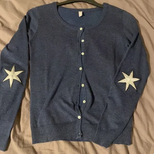 Här är en mörkblå stickad kofta med stjärnor på armbågarna. Jätte Stockholmsstil och verkligen något att ha . Säljer på grund av inte min stil längre🫶
