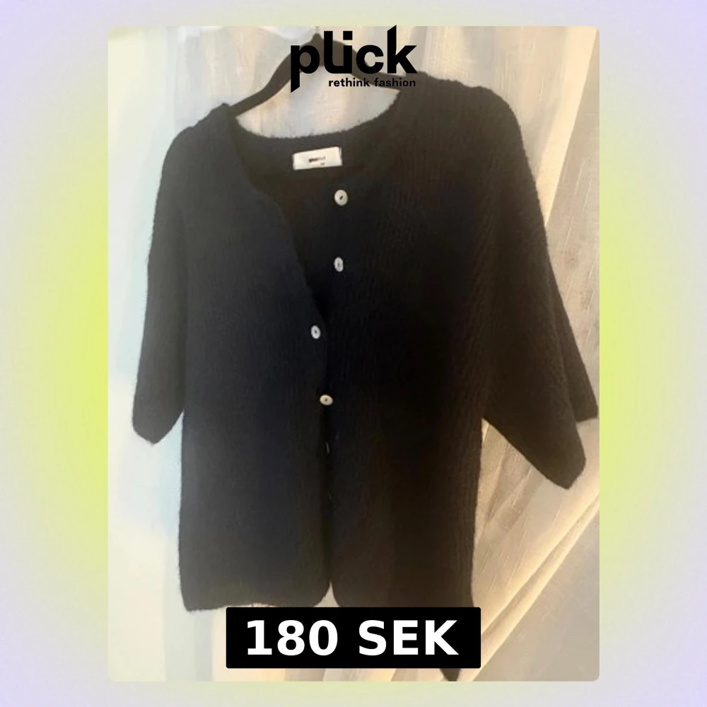 Mysig mörk marinblå/svart kofta från Gina Tricot med trekvarts ärmar och rund halsringning. Koftan har en lös passform och stängs med vita knappar framtill. Materialet är fluffigt och mjukt. Perfekt för lager på lager och en chill look. Helt oanvänd. Nypris: 329:-