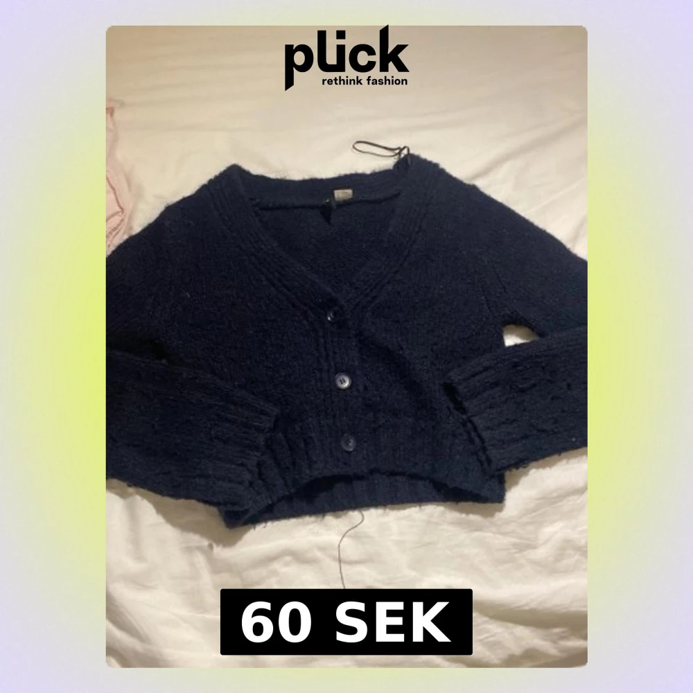 Mysig mörkblå stickad kofta med tre knappar framtill och v-ringad hals. Modellen är cropped och har långa ärmar med ribbade muddar. Perfekt att slänga över en topp för en chill look.