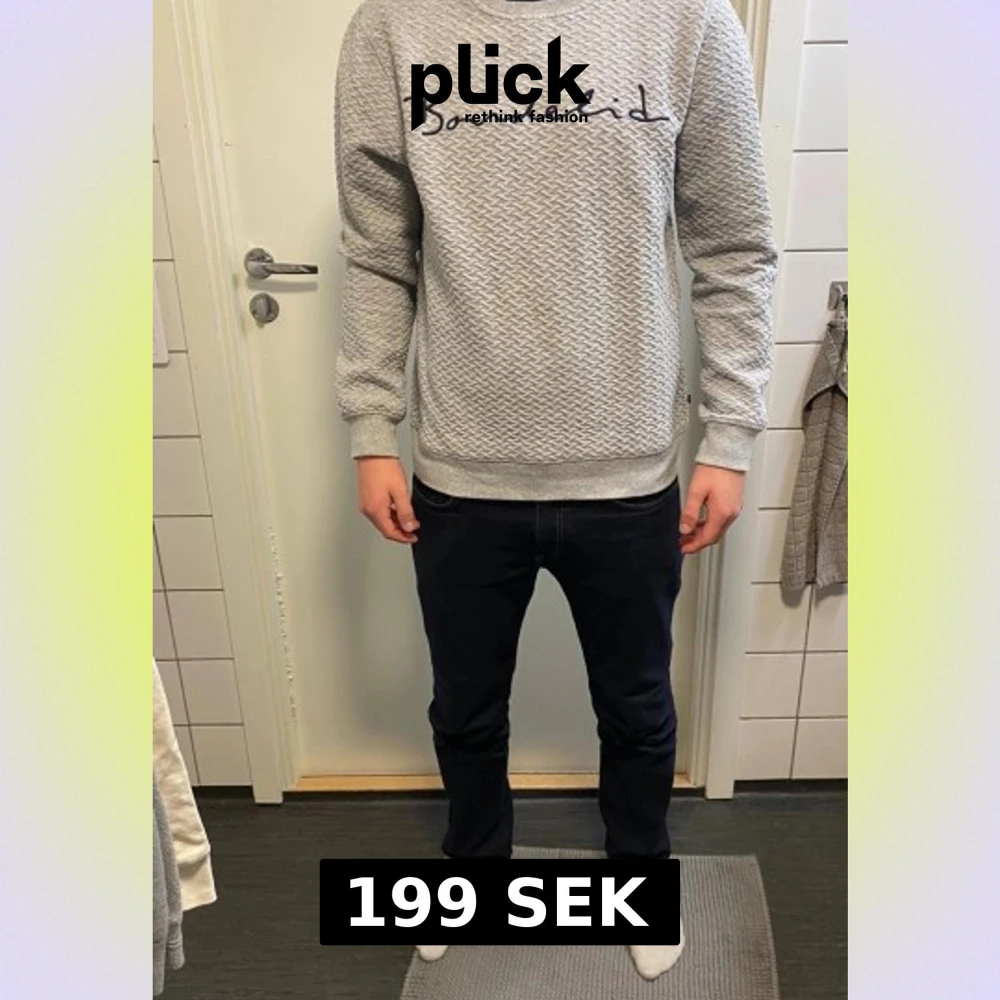 Säljer en grå sweatshirt från Bondelid med diskret mönster och broderad logga framtill. Tröjan har rund halsringning, långa ärmar och ribbade muddar. Perfekt för dig som gillar stilren och bekväm design.