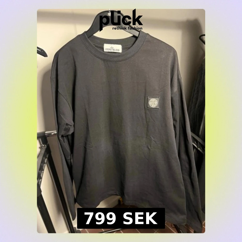 Säljer en svart långärmad t-shirt från Stone Island med klassisk patch på bröstet. Tröjan har rund halsringning och är gjord i mjuk bomull för en skön och avslappnad stil. Perfekt för dig som gillar streetwear och vill ha något stilrent.