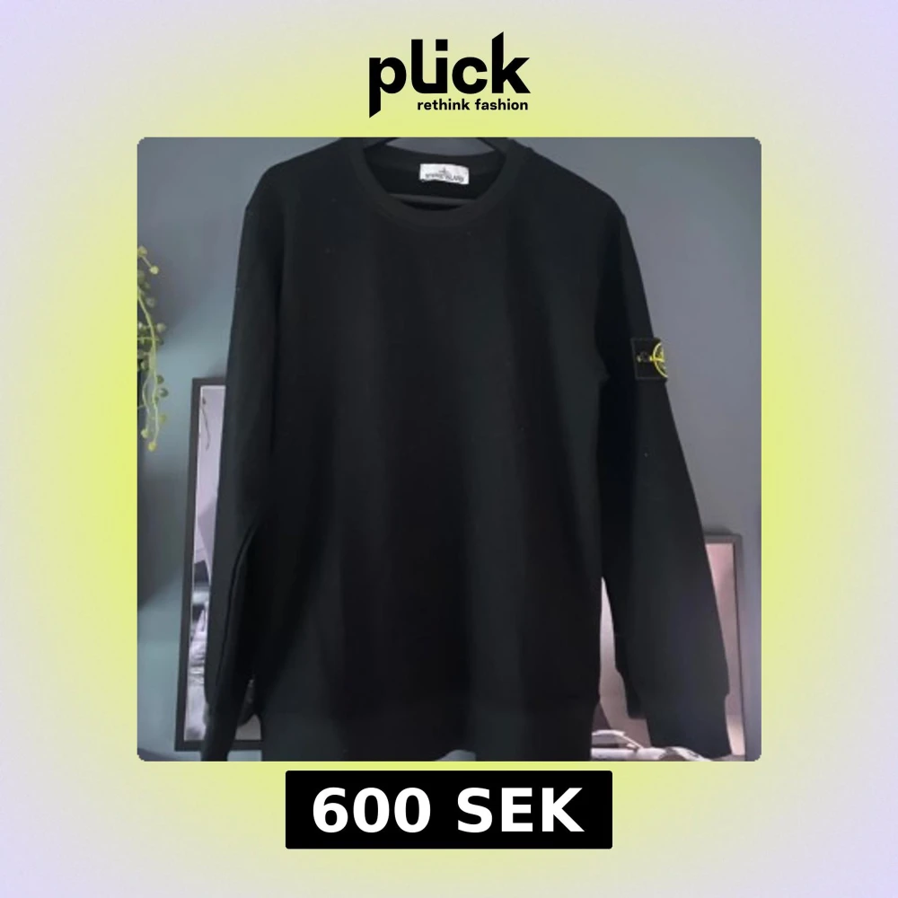 Säljer en svart sweatshirt från Stone Island med klassisk rund hals och ikonisk logotyp-patch på ärmen. Helt oanvänd.