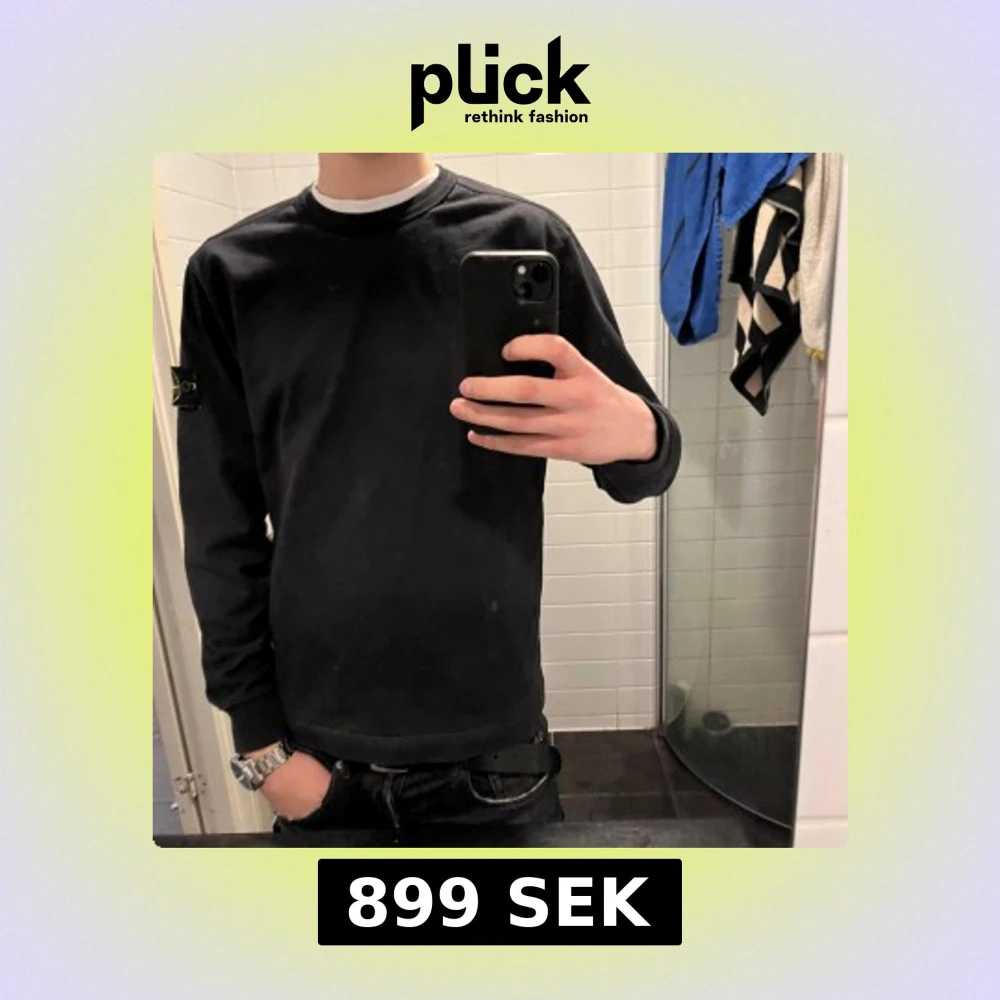 Säljer en stilren svart tröja från Stone Island med deras ikoniska märke på ärmen. Tröjan har en klassisk rund hals och långa ärmar, perfekt för en casual look.