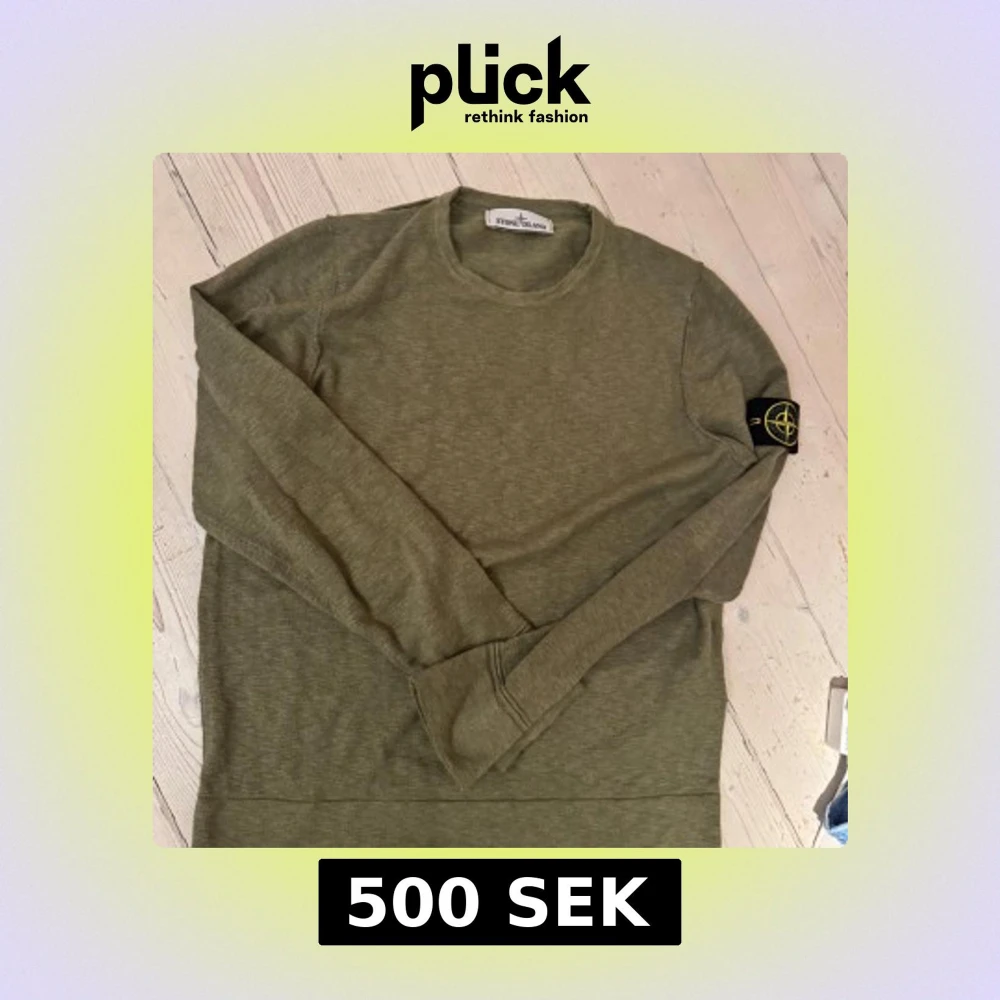 Säljer en stilren olivgrön tröja från Stone Island. Tröjan har långa ärmar och en rund halsringning. Den ikoniska Stone Island-loggan sitter på ärmen. Perfekt för en avslappnad och trendig look.