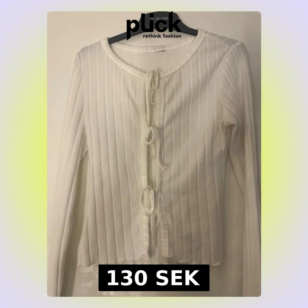 Säljer en söt vit ribbad kofta med långa ärmar och tre knyt framtill. Koftan har en rund halsringning och är gjord i ett mjukt material som känns skönt mot huden. Perfekt att slänga över en topp för en chill look.