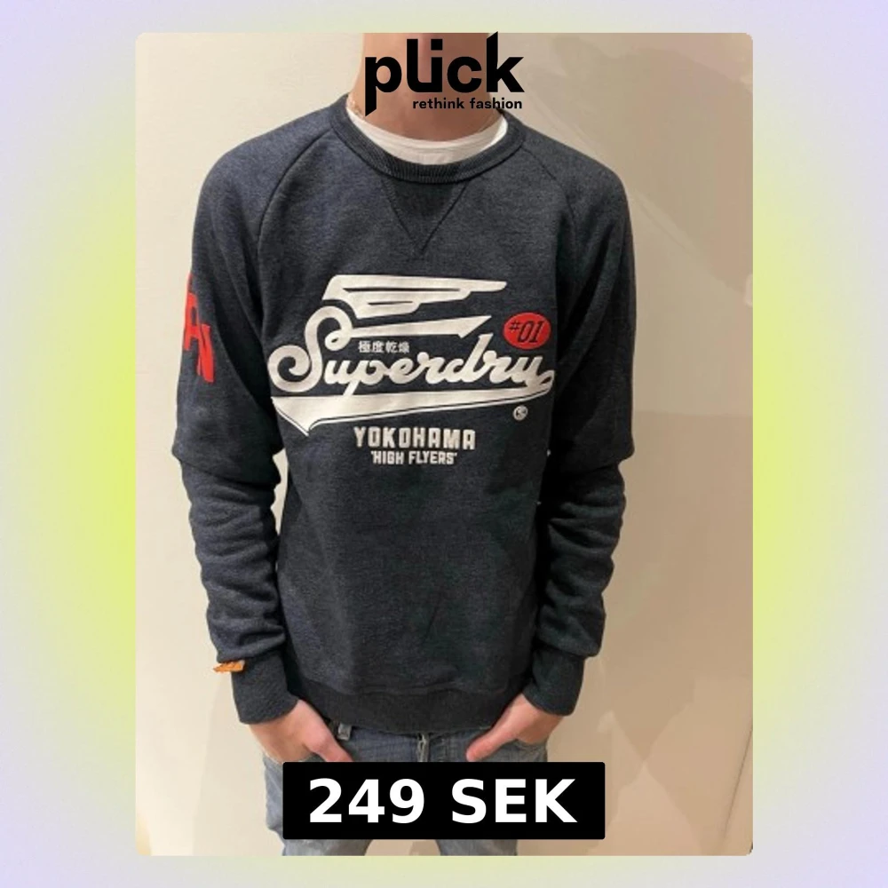 Mörkblå sweatshirt från Superdry med stort vitt tryck och japanska tecken på bröstet