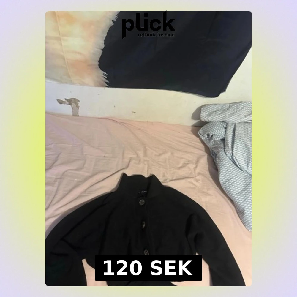 Säljer en svart kofta köpt i turkiet med hög krage och tre stora knappar framtill. Koftan har långärmad design och ribbade muddar vid ärmslut och nederkant. Perfekt för lager på lager under kyliga dagar.
