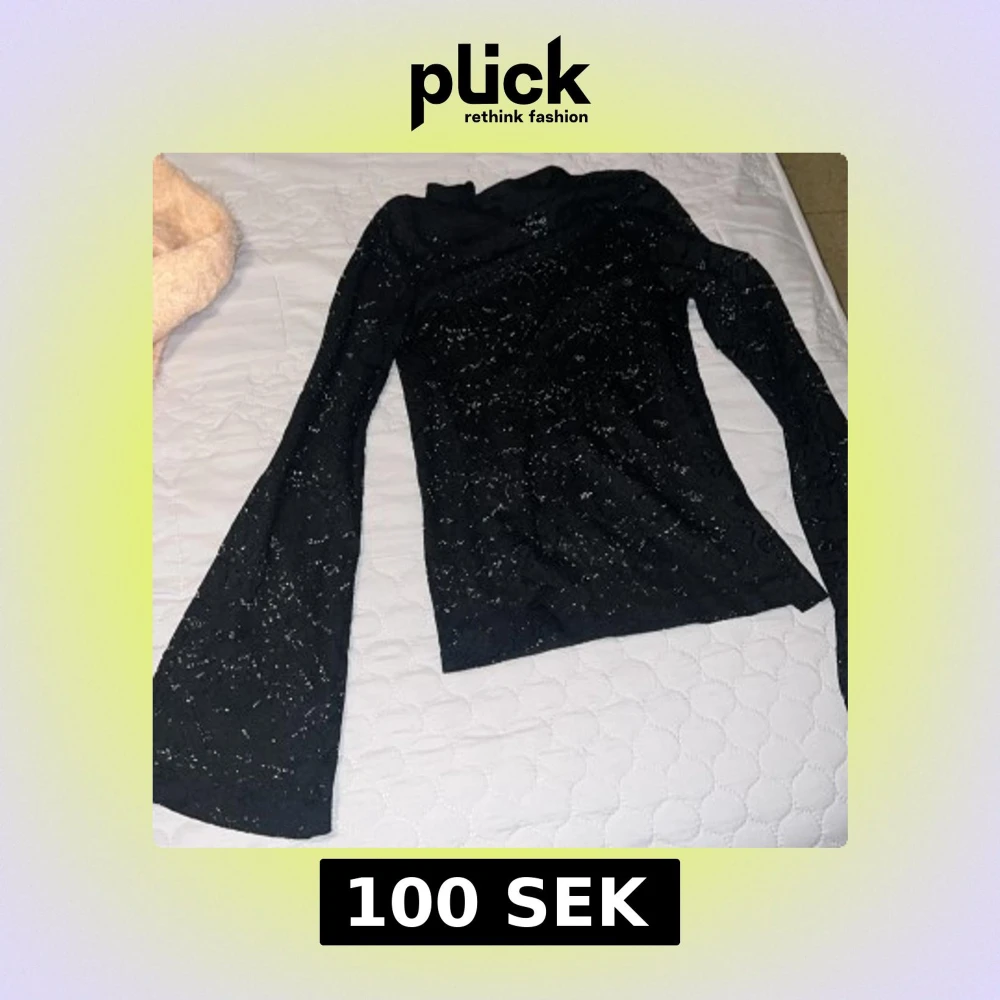 Säljer en svart tröja med spets mönster. Tröjan har långa ärmar och en elegant passform som passar perfekt för festliga tillfällen. Materialet är mjukt och bekvämt.