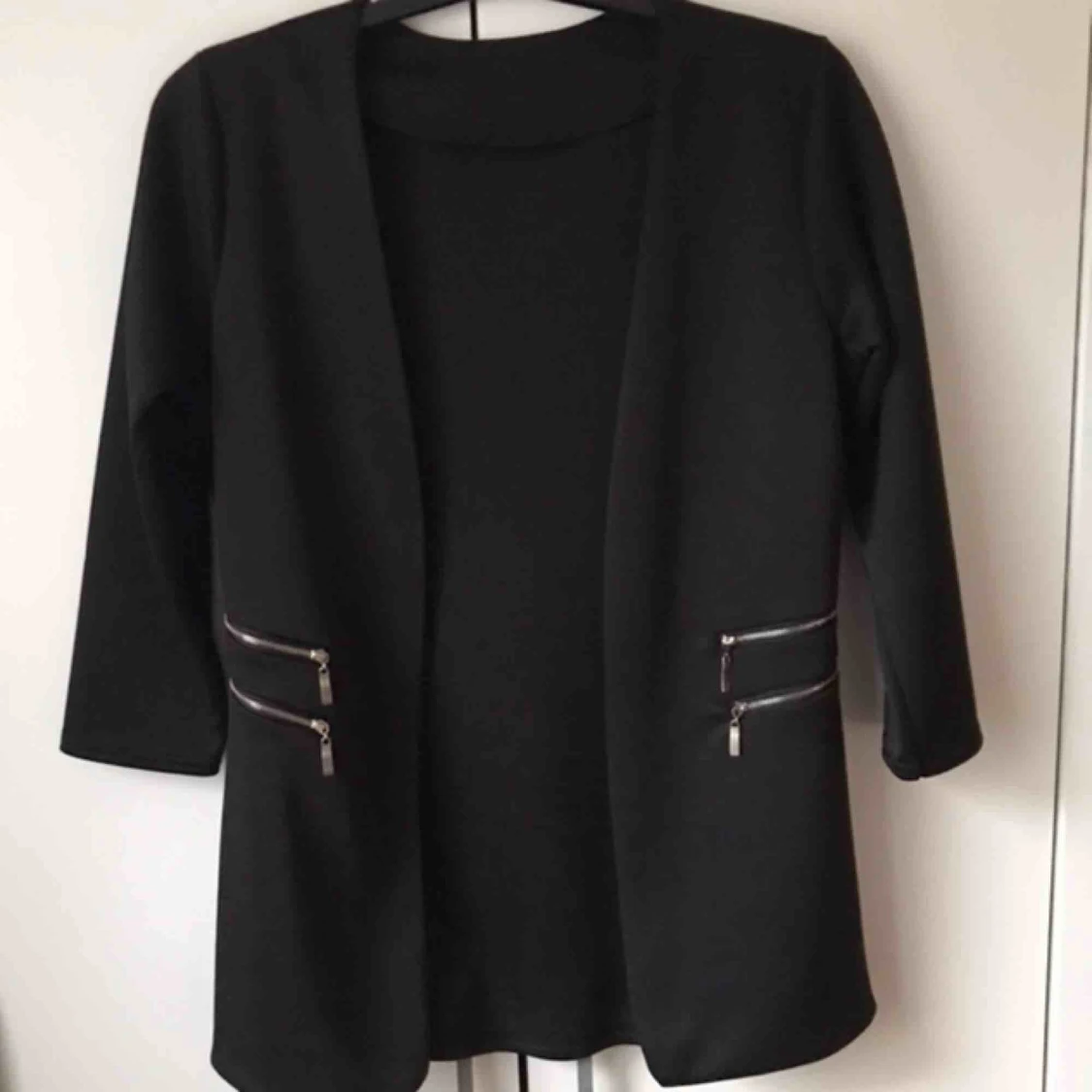Väldigt snygg längre svart kavaj med trekvarts ärmar och 2 silver dragkedjor på båda sidor, det är rejäla fickor, får plats med mycket i de. Använd fåtal gånger, i fint skick!