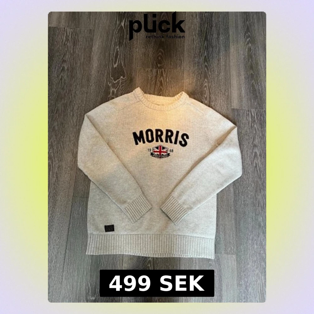 Snygg grå stickad tröja från Morris med svart broderad logga och brittisk flagga på bröstet. Tröjan har rund hals, ribbade muddar och nederkant samt en liten patch nertill. Perfekt för dig som gillar klassisk och stilren design. I storlek S har och gör bara av er vid frågor🙌 Pris går att diskutera så hör av er vid funderingar över pris.💯