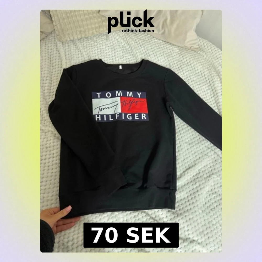 Svart sweatshirt från Tommy Hilfiger med stort tryck på bröstet i vitt, rött och marinblått. Klassisk rund halsringning och långa ärmar. Perfekt för en avslappnad och stilren look.
