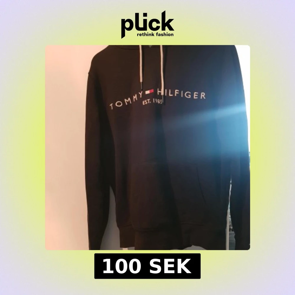 Svart hoodie från Tommy Hilfiger i storlek S med vit snörning och klassisk logga tryckt på bröstet. Tröjan har huva, magficka och långa ärmar. Materialet är mjuk bomull och polyester, perfekt för chill dagar. Snygg och enkel design med streetkänsla.