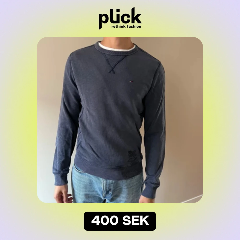 En marinblå tröja från Tommy Hilfiger i skönt tunt material. I storlek S men mer som en M. Använd men i fint skick.