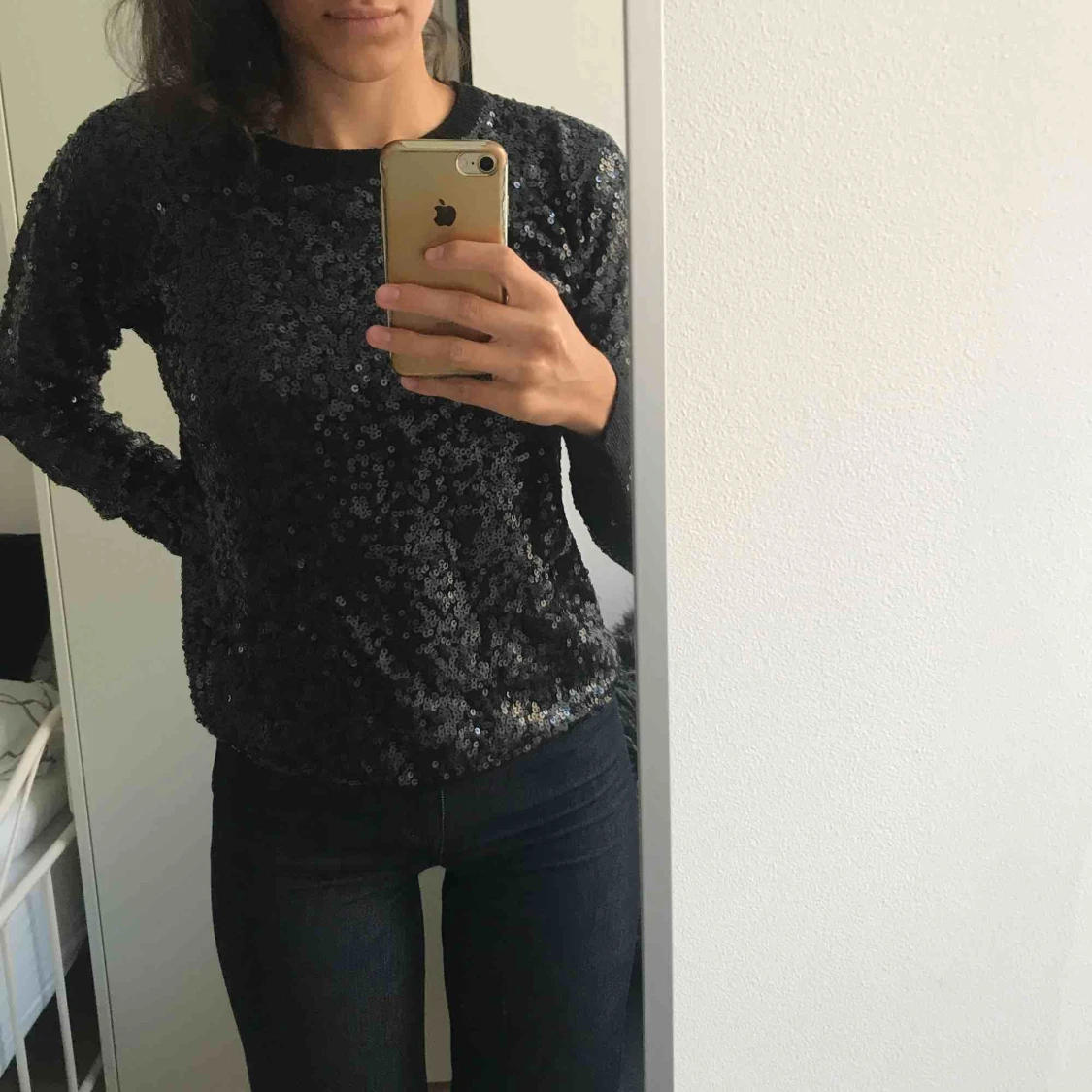 Svart tröja med paljetter på! ❤️ Aldrig använd. Säljer då jag redan har en likadan. Köpt från Top Shop i London. Frakt ingår inte i priset. Kan skicka mer bilder vid intresse. Som referens brukar jag ha storlek 34/36 - tycker inte denna är stor på.