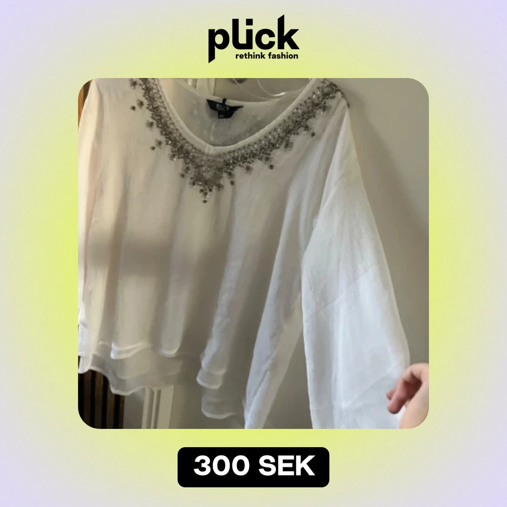 Jätte fin och elegant trrkvartsärmad tröja. Med strass runt halsen och fint lite genomskinligt matrial. Säljer pga för stor. Det står 32/34 men skulle säga 32/38. Den skulle passa många storlekar