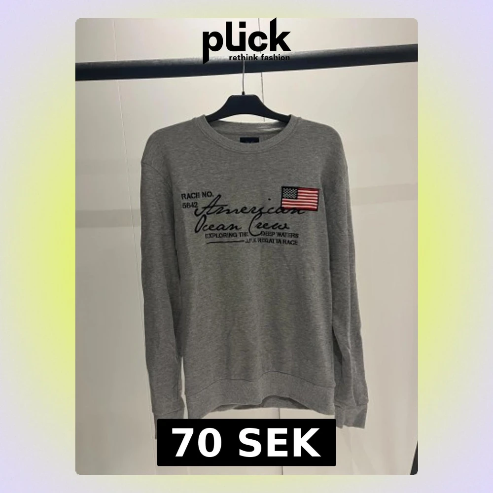 Snygg grå sweatshirt från J.F.K med broderad amerikansk flagga och texten 'American Ocean Crew' på bröstet. Tröjan har rund hals, långa ärmar och är gjord i mjuk bomull. Den är i fint skick!