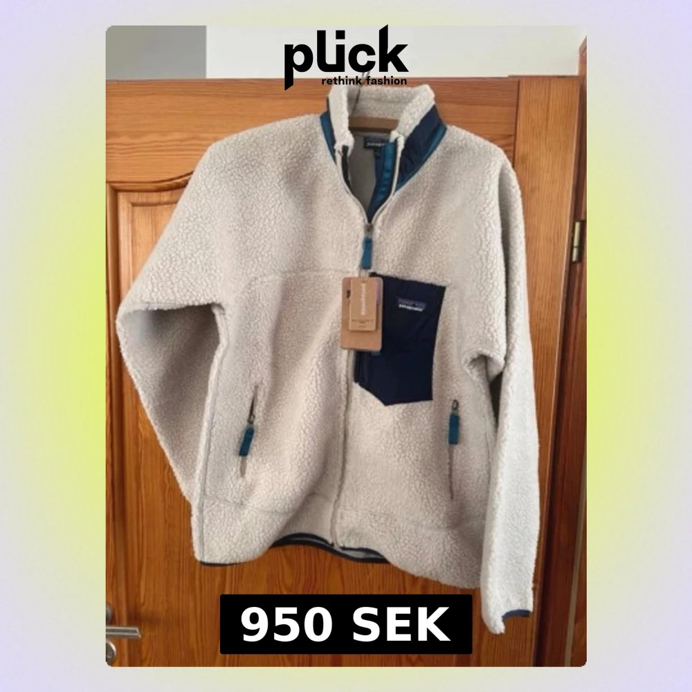 Mysig beige teddyjacka från Patagonia med blå detaljer. Jackan har hög krage, dragkedja framtill, tre fickor med dragkedja och en kontrasterande bröstficka. Perfekt för kalla dagar och har en avslappnad passform.