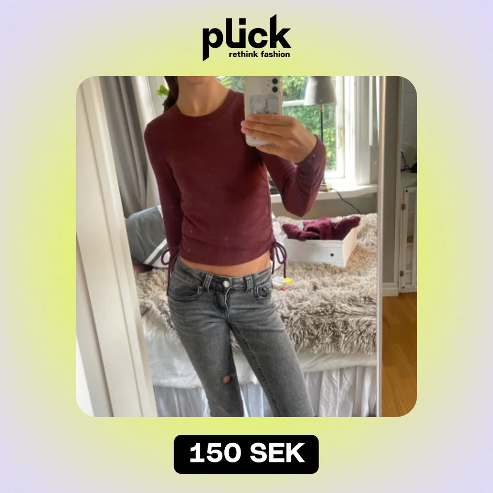 Säljer en snygg vinröd ribbad tröja med långa ärmar. Den är croppad och har en cool snörningsdetalj på sidorna som ger en extra touch. Perfekt för höst och vår när du vill ha något stilrent men ändå lite edgy. Passar bra till både jeans och kjol!